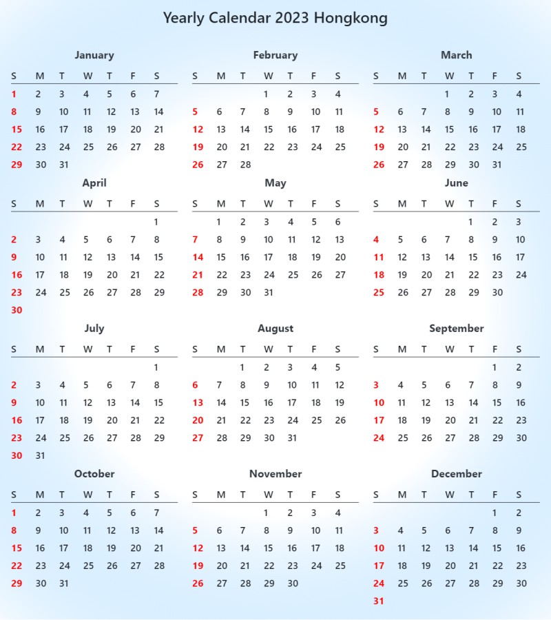 Yearly Calendar 2023 Hongkong